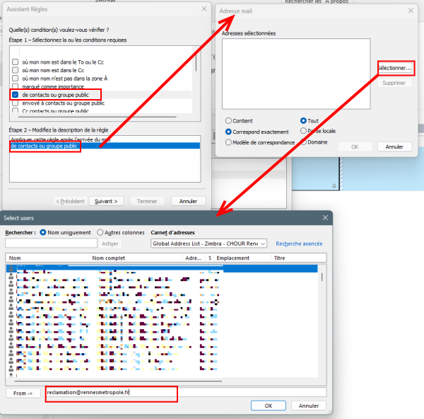 | + | {{Pin|...Dans notre exemple, la règle doit s'appliquer aux mails expédiés par reclamation@rennesmetropole.fr. La condition à cocher est donc : "de contacts ou groupe public"}} | ||