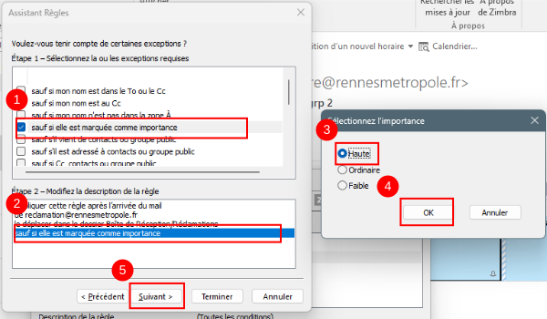 Désormais, dans l'exemple, tous les mails envoyés par reclamation@rennesmetropole.fr seront automatiquement rangé dès leur réception dans le dossier "Réclamations", sauf si le mail est marqué comme "de haute importance"