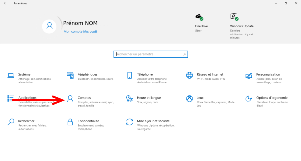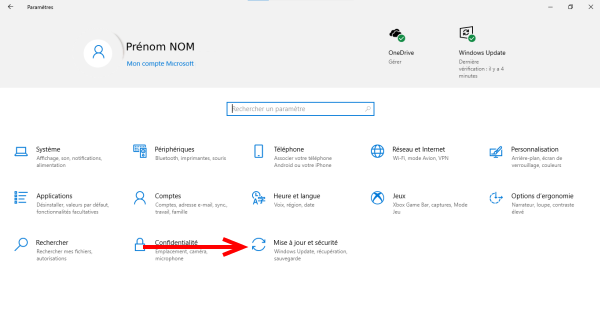 Dans les paramètres, cliquer sur la rubrique "Mise à jour et sécurité"