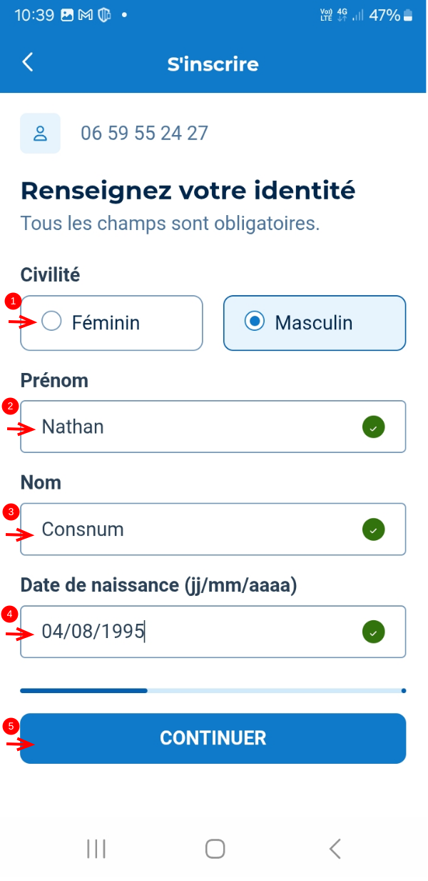 4- Remplissez votre Date de naissance en respectant le format demandé (jj/mm/aaaa)