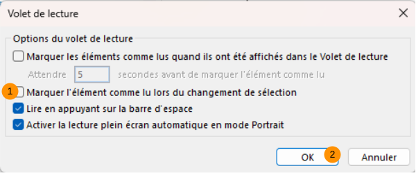 - Décochez l'option Marquer l'élément comme lu lors du changement de sélection