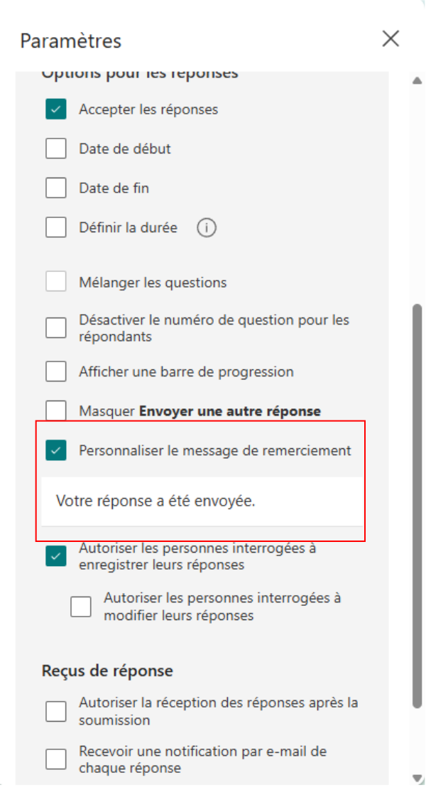 1- Cochez la case Personnaliser le message de remerciement
