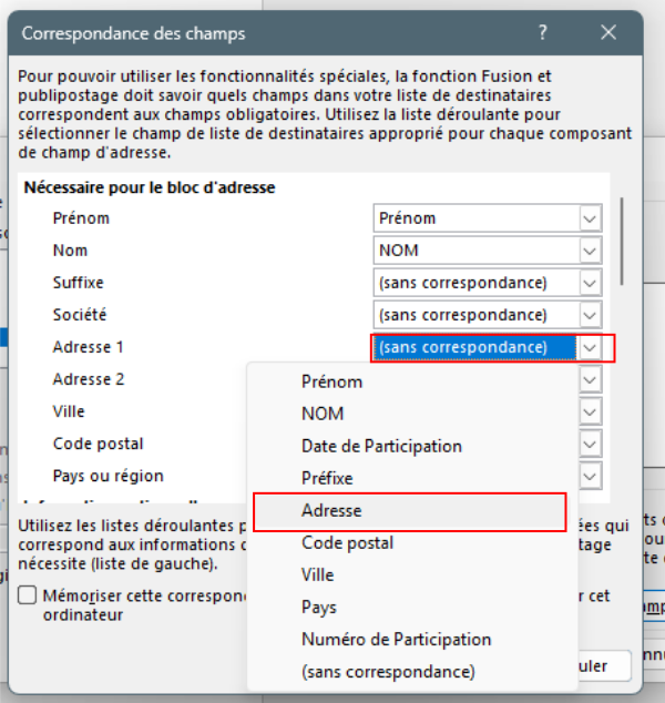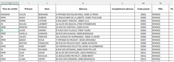 Ce court tutoriel indique le fonctionnement de cette optionDans le fichier excel qui va être lié aux données, indiquer tous les éléments qui doivent figurer dans le bloc d'adresse des courriers.