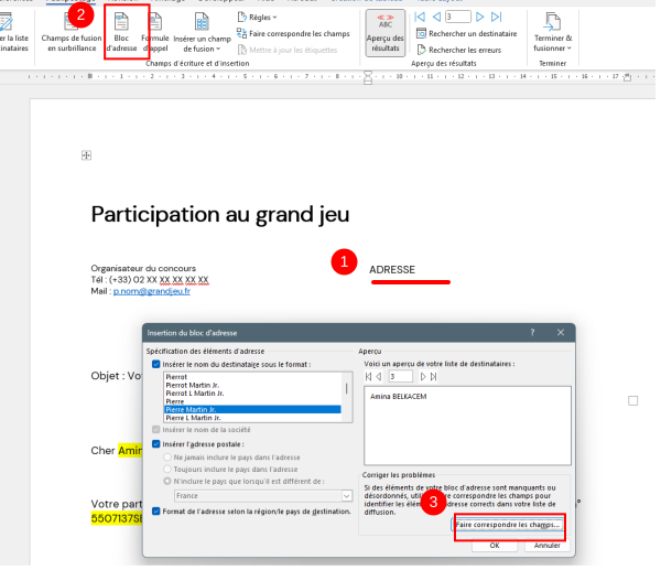 Tout d'abord, cliquer dans le document à l'endroit où doit apparaître le bloc d'adresse (1)