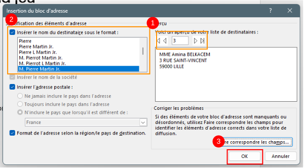 Une fois les informations vérifiées, cliquer sur "Ok"(3) pour terminer la création du Bloc d'adresse.